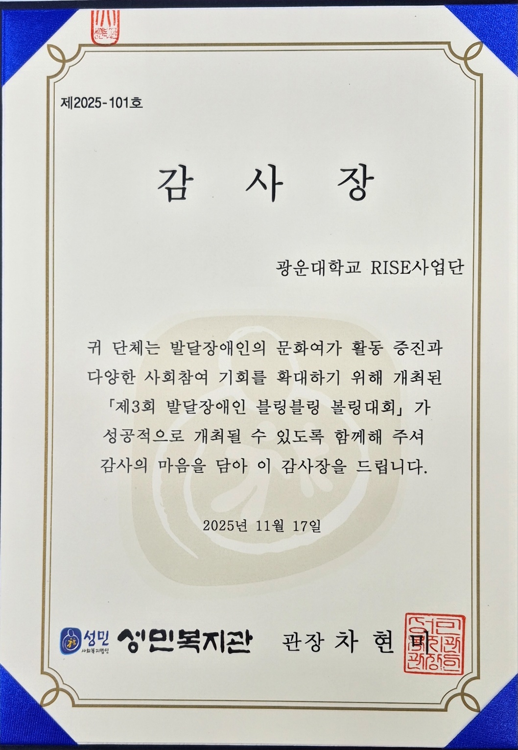 [°¨»çÀå ¼ö»ó] ±¤¿î´ëÇб³ RISE µ¹º½ »ç¾÷´Ü, ¼º¹Îº¹Áö°üÀ¸·ÎºÎÅÍ °¨»çÀå ¼ö»ó