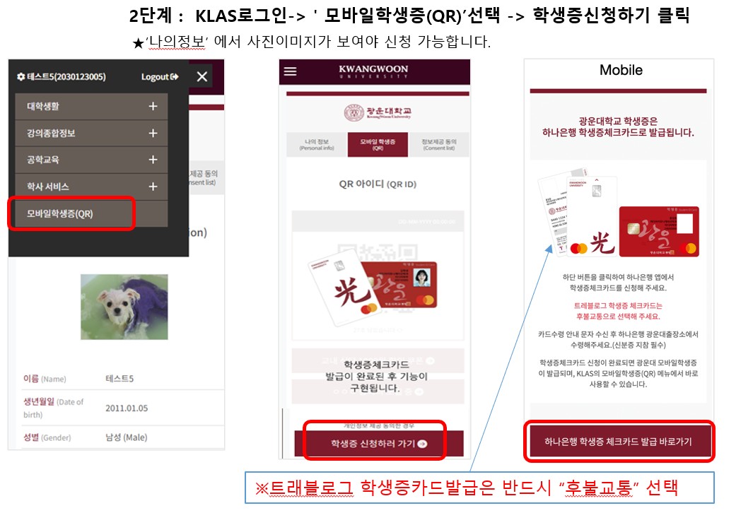 *½Å(Æí)ÀÔ»ý ÇлýÁõ ½Åû 1. Ŭ¶ó½º(https://klas.kw.ac.kr/) »çÁø È®ÀÎ µû·Î ¼³Á¤ÇÏÁö ¾ÊÀ» ½Ã ¿¬µ¿µÇ¾î ÀÖ´Â »çÁøÀ¸·Î ÀÚµ¿ ¼³Á¤µÊ. ¹Ýµå½Ã È®Àοä¸Á °¡) »çÁø µî·Ï ±â°£ : 2026. 3. 5.(¸ñ) ~ 2026. 3. 11.(¼ö)14:00 ¡Ø±â°£ ÀÌÈÄ Á¦Ãâ °ÇÀº ´ÙÀ½ Çб⠽Åû±â°£¿¡ °¡´É¡Ø ³ª) ¾÷·Îµå ¹æ¹ý : Ŭ¶ó½º>³ªÀÇÁ¤º¸>»çÁøº¯°æ ¾÷·Îµå ÷ºÎÆÄÀÏ : Áõ¸í»çÁø 1ºÎ jpg ÇüÅ·ΠÁ¦Ãâ(Áõ¸í»çÁø ÆÄÀÏÀ̸§: Çйø.jpg)(¹Ýµå½Ã jpg·Î, ÆÄÀϸíÀº ÇйøÀ¸·Î Á¦Ãâ) ¡Ø¾ó±¼ ÀνÄÀÌ ¾î·Æ°Å³ª »çÀÌÁî°¡ ¸ÂÁö ¾ÊÀ» °æ¿ì ¹Ý·ÁµÉ ¼ö ÀÖÀ½. ´Ù) ¿Â¶óÀÎ ÇлýÁõ ¹ß±Þ ±â°£: 2026. 3. 12.(¸ñ)ÀÌÈÄ ¶ó) ¹ß±Þ ¹æ¹ý : ÷ºÎÆÄÀÏ(±¤¿î´ë´ëÇпø ÇлýÁõÄ«µå ½Åû¾È³»(pptx)) Âü°í 2. ÇϳªÀºÇà °èÁ °³¼³(¸ð¹ÙÀÏ °¡´É) ¡ØÇϳªÀºÇà °èÁ°¡ ¾ø´Â Çлý Áß, ÃÖ±Ù 20ÀÏ À̳»¿¡ Ÿ ÀºÇà °èÁ¸¦ °³¼³ÇÑ °æ¿ì ºñ´ë¸é °¡ÀÔÀÌ Á¦ÇÑµÉ ¼ö ÀÖÀ½. ÀÌ °æ¿ì ÇϳªÀºÇà ±¤¿î´ëÁ¡¿¡ Á÷Á¢ ¹æ¹®ÇÏ¿© °èÁ °³¼³ÇÊ¿ä.2026. 3. 12.(¸ñ)ÀÌÈÄ °¡) ½Åû ¹æ¹ý : ÇϳªÀºÇà ±¤¿î´ëÃâÀå¼Ò(02-918-1111) ¹æ¹®ÇÏ¿© Á÷Á¢ ½Åû ³ª) ½Åû ±â°£ : ¿µ¾÷½Ã°£ ³»(09:00~16:00) ¹æ¹®ÇÏ¿© ½Åû °¡´É ´Ù) ¼ö·É ¹æ¹ý : ½Åû ÈÄ ¾à 1~2ÁÖ À̳» ¼ö·É ¾È³» ¹®ÀÚ ¼ö½Å ÈÄ ½ÅºÐÁõ ÁöÂüÇÏ¿© ¹æ¹® ¼ö·É