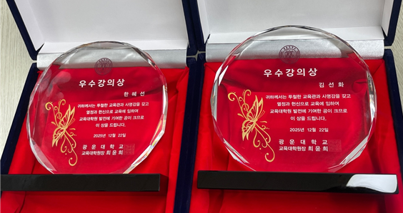 ±³À°´ëÇпø ±è¼±È ±³¼ö´Ô°ú ÇÑÇý¼± ±³¼ö´Ô²²¼ 2025Çг⵵ 2Çб⠿ì¼ö°ÀÇ»óÀ» ¼ö»óÇϼ̽À´Ï´Ù. µÎ ±³¼ö´Ô²²¼´Â ¿Á¤ÀûÀÎ °ÀÇ¿Í ¼º½ÇÇÑ Áöµµ¸¦ ÅëÇØ ±³À° ¹ßÀü¿¡ ±â¿©ÇϽаø·Î¸¦ ÀÎÁ¤¹Þ¾Æ À̹ø ¿ì¼ö°ÀÇ»ó ¼ö»óÀÇ ¿µ¿¹¸¦ ¾È°Ô µÇ¾ú½À´Ï´Ù. À̹ø ¼ö»óÀ» Áø½ÉÀ¸·Î ÃàÇϵ帮¸ç, ¾ÕÀ¸·Îµµ ±³¼ö´ÔµéÀÇ Áö¼ÓÀûÀÎ ±³À° ¹× ¿¬±¸ Ȱµ¿À» ÀÀ¿øÇÕ´Ï´Ù.